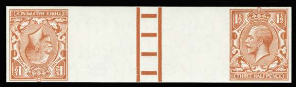 1924 1½d Red-brown (Wmk. Block Cypher). Superb unmounted o.g.imperforate horizontal tête-bêche advertising gutter (52mm) pair of imprimaturs showing marginal pillars with "BPMA" handstamps on reverse. Very rare.