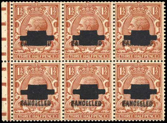 GB 1924-26 1½d booklet pane punched and overprinted ‘CANCELLED’