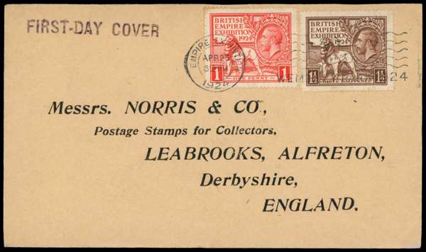 1924 1d and 1½d Wembleys on plain, printed FDC tied by machine cancel “EMPIRE EXHIBITION/ APR 23/1924”, fine. SG 430/431