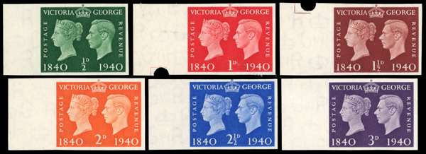 1940 ½d-3d Centenary of the first adhesive postage stamp. Superb unmounted o.g. set of six left hand marginal imperforate imprimaturs with "BPMA" handstamps on reverse. Very scarce.