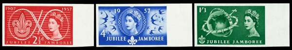1957 2½d-1s3d World scout Jubilee Jamboree. Superb unmounted o.g imperforate right hand marginal set of three imprimaturs each with a "BPMA" handstamp on reverse. Scarce.