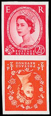 1963 ½d+2½d "Wildings" (Wmk. Crowns, Chalky paper). Superb unmounted o.g vertical tête-bêche pair of imperforate imprimaturs each with a "BPMA" handstamp on reverse. Scarce.