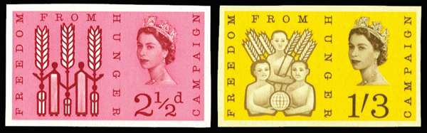1963 2½d-1s3d Freedom from Hunger (Ordinary). Very fine unmounted o.g. pair of imperforate imprimaturs with "NPM IMPRIMATUR" handstamps on reverse. Scarce.