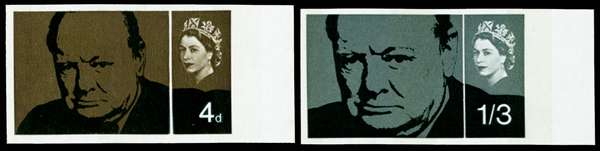 1965 4d-1s3d Churchill Commemoration (Phosphor). Superb unmounted o.g. right hand marginal pair of imperforate imprimaturs, each stamp with a "BPMA" handstamp on reverse. Scarce.
