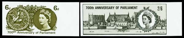1965 6d-2s6d 700th Anniversary of Parliament (Ordinary). Superb unmounted o.g. right hand marginal set of two imperforate imprimaturs, each stamp with a "BPMA" handstamp on reverse. Scarce.