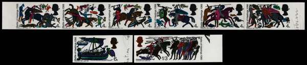 1966 4d-1s3d 900th Anniversary of the Battle of Hastings (Ordinary). Superb unmounted o.g. marginal set of eight imperforate imprimaturs (4d values as a se-tentant strip of six), each stamp with a "BPMA" handstamp on reverse. Scarce.