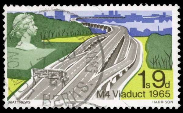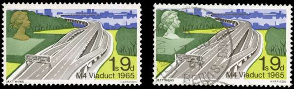 1968 British Bridges 1s9d M4 Viaduct variety 'GOLD (QUEEN'S HEAD) OMITTED', fine used. Normal example mint for comparison. SG 766ya, unpriced