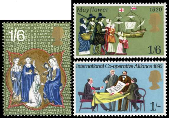1968-70 group of colour omission errors on a stockcard, including 1968 Christmas 4d with vermilion omitted and with ultramarine omitted, 1969 Ships 5d with grey (decks, etc.) omitted, 1970 Anniversaries 1s with green omitted and 1s6d with emerald omitted, 1970 Christmas 1s6d with salmon omitted. All mint, unmounted o.g. and offered with the normal stamps for comparison. Cat: £1,590. (6)