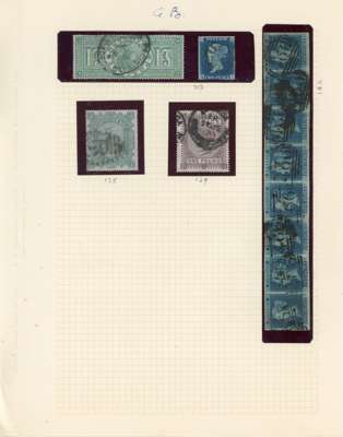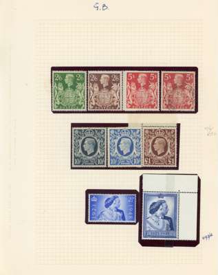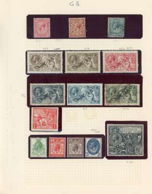 1840 to 1948 mint and used on album leaves including used 1840 1d black 4-margin, 2d blue 3-margin and horizontal strip of 3 (NJ-NL) 4-margin, 1841 2d blue horizontal strip of 8 (SD-SK), KEVII 2s6d, 5s and 10s, 1902 £1 green, 1878 10s greenish grey, £1 brown-lilac, 1883 5s and 10s, 1884 £1 brown-lilac, 1891 £1 green, 1913 £1 green, 1939 to £1 including 10s dark blue, mint 1867 6d mauve (without hyphen), 1887 Jubilees to 1s (both), KGV seahorses 2s6d (3), 5s (2) and 10s (2), 1929 £1 PUC, 1934 re-engraved to 10s, 1960 3d block of 4 showing phantom ‘R’ in bottom margin, 1966 6d World Cup black shift to left. Mixed condition still with some good to fine, careful viewing will pay dividends. (101)