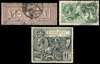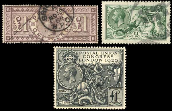 1884 £1 brown-lilac watermark three Imperial Crowns with central cds , a couple of short perfs at top, 1913 £1 green Seahorse, short perf lower left, used with parcel cancel and 1929 £1 PUC black, central cds. (3) SG 185, 403, 438 £4,750