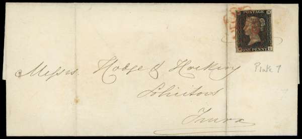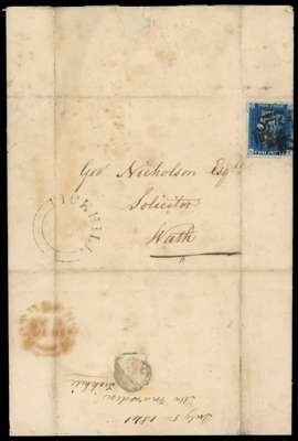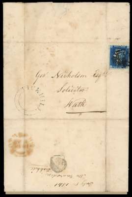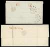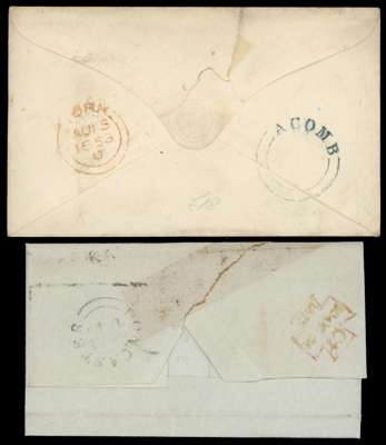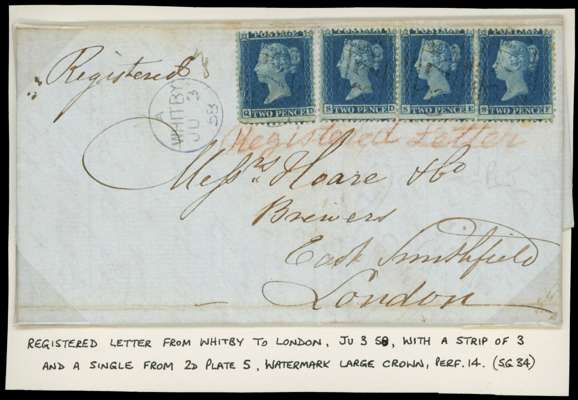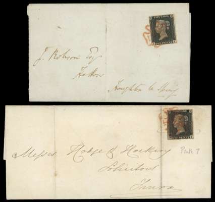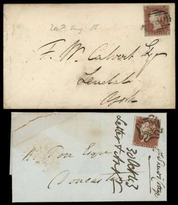 1840-1858 Line Engraved postal history selection including: 1840 1d black on entires (2, both 4 margins) tied by red MCs, 1840 2d blue (4 margins) used by black MC on entire to Wath, 1841 1d red on entire to Doncaster tied by No 3 in MC, and 1858 registered letter to London franked by 1854-57 2d blues (4). Generally fine. (6)