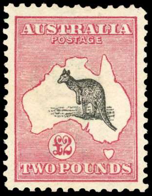 1913 £2 black and rose mint, facially good with a couple of very slightly shorter perfs at top. Part o.g, with some light discolouration on the reverse, and a bend at base. A very scarce stamp. SG 16, £7500