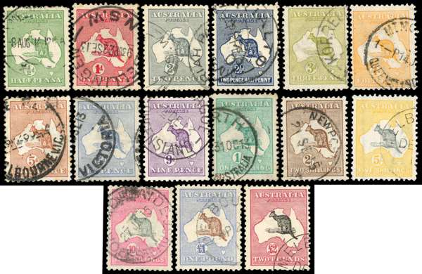 1913-4 set of fifteen to £2, used. The values to 2s are commercially used, with a few faults; the 10s with a slightly smudged Port Adelaide datestamp of 27 JA 15; the 5s, £1 and £2 are CTO'd. The £1 is fine, the £2 has slightly short perfs at base. Scarce. SG 1-16, £7000