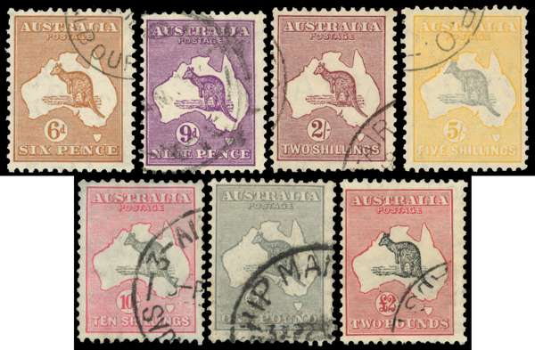1931-6 watermark 15 Kangaroo set of seven, used. A reasonable set, variable centering, with a few slightly short perfs. SG 132-8, £1000