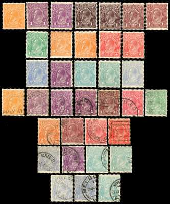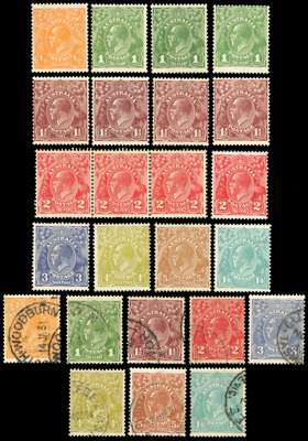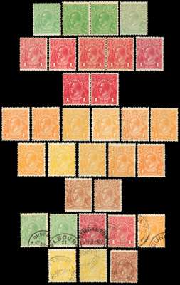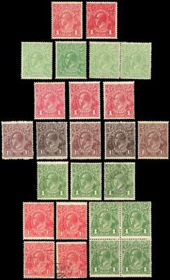 1914-36 collection of King's Heads on Hagner sheets, with better material. Mint: 1914-20 range including five shades of 1d including SG 21ce (RPS), eleven 4ds with all SG shades, both 5d shades; 1916-8 1ds (2), 1917-20 with shades; 1918-23 with shades to 1s4d (2), including 4d milky blue; 1924-5 at least two of each; 1926-30 perf 14 and 13½ x 12½ sets, and 1931-6 set plus 1d and 2d inverted watermarks. Condition appears to be chiefly good. A range of used, less extensive but still very useful, accompanies. Between 20/131