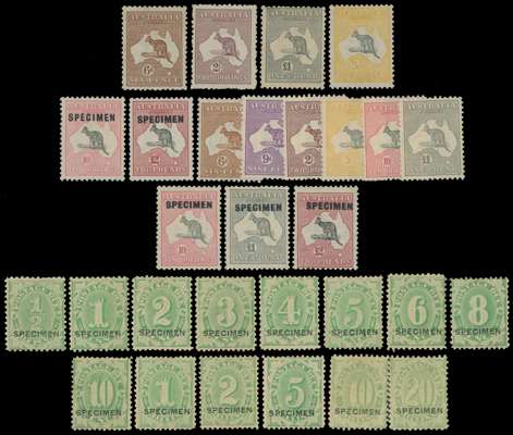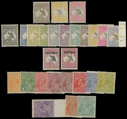 1913 to mint range on stock cards including 1913 2s, 5s and 10s, 1915 2d to £1, £2 overprinted “SPECIMEN” (2), 1923 6d, 2s and £1, 1926-30 to 1s4d, 1929 5s, plus 10s and £2 overprinted “SPECIMEN”, 1931-36 6d to £1, plus 10s, £1 and £2 overprinted “SPECIMEN”, and 1902 postage dues to 20s overprinted “SPECIMEN”. Slightly mixed condition still with many good to fine. (56) SG 12/D44
