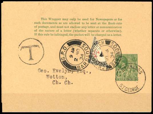 1934 ½d green postal stationery wrapper, used from St George to Christchurch with fine Barbados St. George cds for 2 NOV, circular ‘’T'' tax marking at left and bearing bisected 1934-47 Postage Due 1d black with m/s ‘½d’ surcharge in red m/s, tied by G.P.O Barbados cds for NOV 2 and additionally struck by Christchurch arrival cds for NOV 3. Philatelic, but exceptional quality and rare. SG D2a £1800