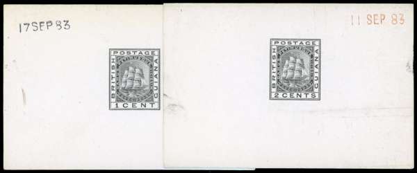 1883 1c and 2c DLR die proofs in black on glazed card (92x60mm) with the former dated ‘17 SEP 83’ at upper left and the latter ‘11 SEP 83’ at upper right in red. A few surface markings clear of the design. A fine pair. SG 170/171var.