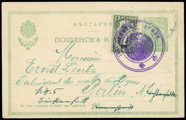 Occupation of Thrace: 1912 5st postal stationery card uprated 5st tied very fine strike of large violet military cachet inscribed 1st regimental Army in Cyrillic, from a soldier to an antiques dealer in Berlin.