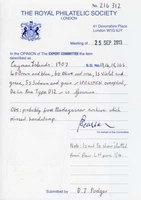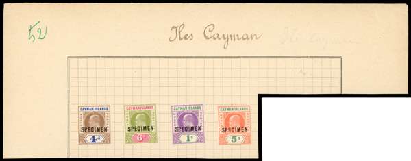1907 set of four to 5s salmon & green, affixed to part of ledger sheet with ‘Iles Cayman’ inscribed at top, each optd ‘SPECIMEN’ type D12, with the 1s & 5s values each showing slotted frame variety (R.1/ 4) fine appearance and rare. Presumably, from the Madagascar archive but missing the usual red handstamp. RPS Cert (2013) SG 13s-16s
