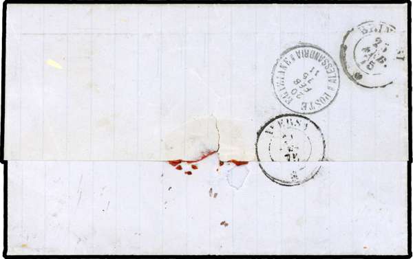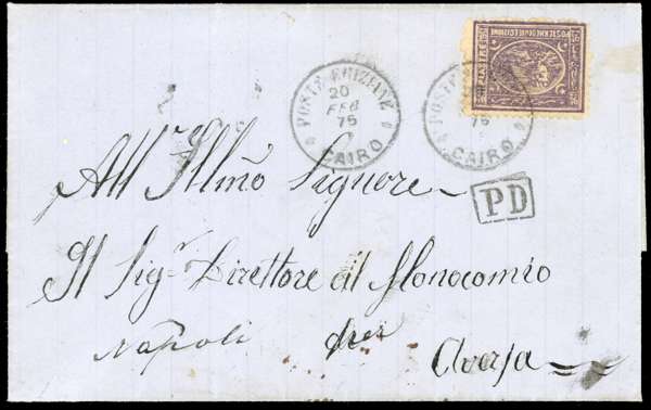 1895 entire to Napoli franked 1 pi tied ‘POSTE EGIZIANE/CAIRO/20 FEB 75’ cds with boxed “PD” handstamp below, POSTE EGIZIANE/ALLESSANDRIA/20 FEB 75’ on reverse and Brindisi transit.