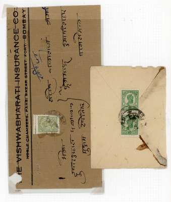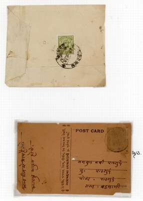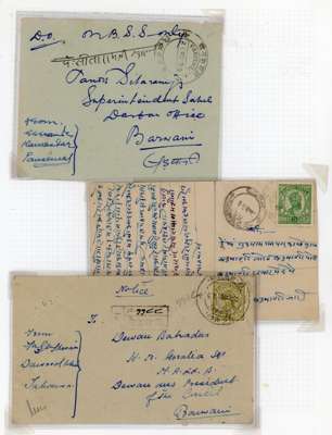 1922-47 postal history collection on pages, including 1922 1a vermilion on native cover (SG 10), 1922 native wrapper bearing pair of 2a purple (SG 11) tied by native bilingual cds, 1928-32 long native wrapper bearing four ½a turquoise-green singles, tied by cdss, 1939(?) stampless local cover bearing bi-lingual Pansemal cds), 1932-47 Devi Singh close setting 4a on registered cover, tied by bilingual cds, wide setting 4a olive-green and printed cover, India KGVI 9p postal stationery card, bearing Imperial Pansemal Barwani State cds for 18 APR 43, mixed condition, an interesting lot.
