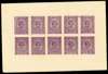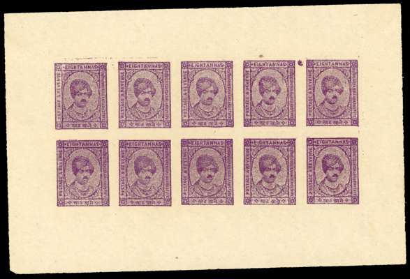 1943-47 8a violet on thick, soft, unsurfaced paper, pin perf, in complete sheet of 10 (5x2), unused without gum as issued, fine. SG 89 cat £350+