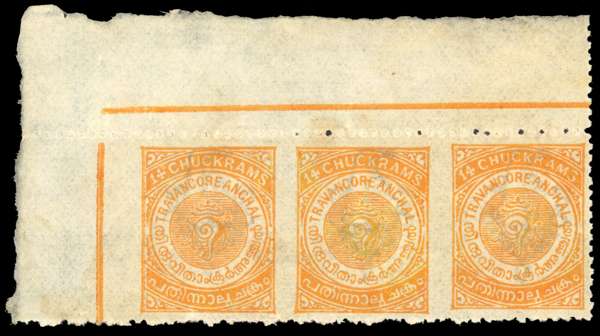 I.F.S Travancore SG 20a imperf between strip of three mint
