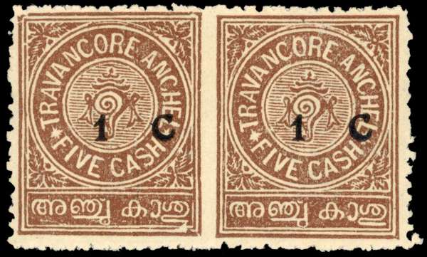 I.F.S Travancore SG 57a imperf between horizontal pair mint