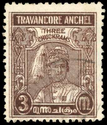 1939 Maharaja's 27th Birthday 3ch brown perf 12½, showing error doubly printed, lightly used by part cds, a fine example of this rare stamp. SG 67a cat £400