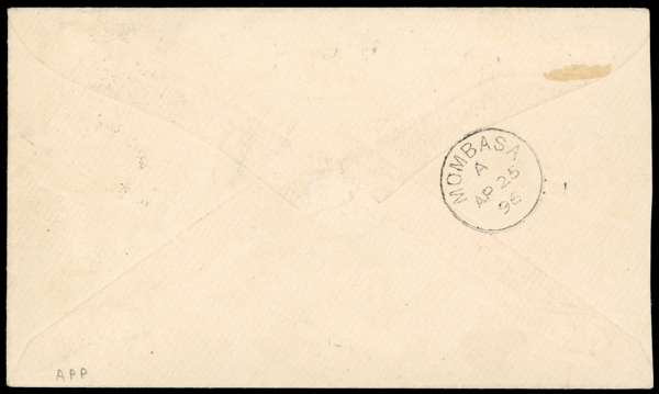 1896 Chambers envelope with 2r overprint, Mombasa squared circle of AP 25. Shows italic ‘c’ in ‘Africa’ (position 12 of one pane). Delivery CDS of same day on reverse; neat. A rare stamp on cover, even without the variety. SG 61