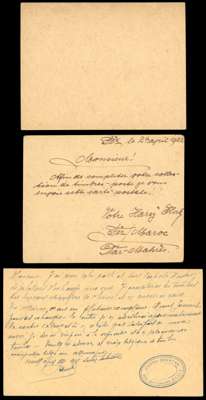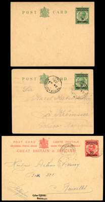 Postal Stationery, 1917 French Currency postal stationery postcards. 5c on ½d unused, and an example commercially used to Czechoslovakia with two strikes of B.P.O. Fez CDS of 24 AP 22. A rare card, H&G 16a. Offered with 1917 10c on 1d card with full message used to Brussels, light Rabat CDS of 21 JA 20, and arrival CDS also on front. Rare. H&G 16b