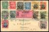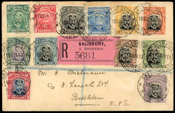 1913 registered envelope to the O.F.S. bearing ½d, 1d, 2½d, Die I 2d, 3d, 4d, 5d, 6d and 2s, also Die II 8d, 10d and 1s. Salisbury CDSs of 19 NOV. Part backflap missing and the 1s and 2s partially overlapped by the registration label, otherwise fine and a very neat cover, ex Birkhead, Michael and Spivack
