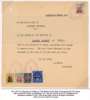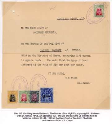 Revenue. 1923 document bearing 10s Head Die IIIB, perf 14, a High Court petition paying the filing fee, with additional 3d, 7s6d and a further 10s Admiral, together with £5 Arms, paying 1% levy on £586/18/2d. Neat oval Master of the High Court cancels; the document folded to fit an album page. SG 309