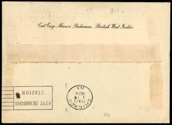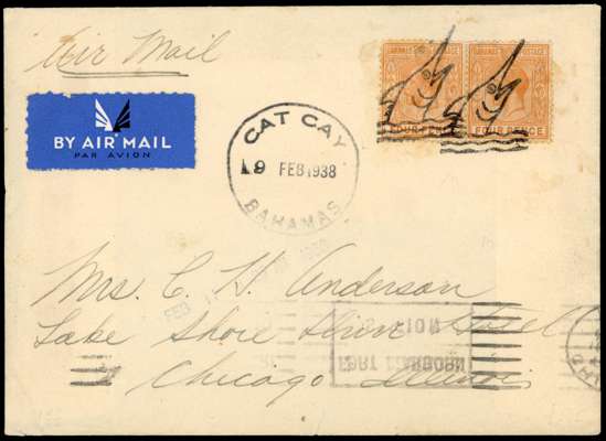 1938 airmail envelope to Chicago with two KG V 4d orange-yellow, cancelled by two strikes of the “Marlin's Head”, with circular Cat Cay TRD of 9 FEB 38 alongside. Offset of Chicago arrival at base. The envelope has ‘Cat Cay Manor’ on backflap. Some slight discolouration, but scarce