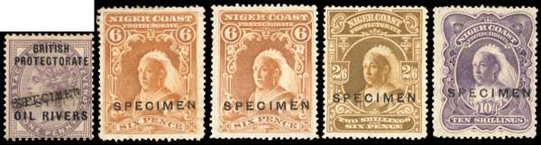 Niger Coast 1897-8 6d (2, shades), 2s6d and 10s set of three overprinted SPECIMEN Type W1, o.g., good appearance but a little gum staining; also 1892 1d lilac, toned o.g., overprinted SPECIMEN Type GB9, showing the overprint triple, unusual. SG 2s, 71s/74s