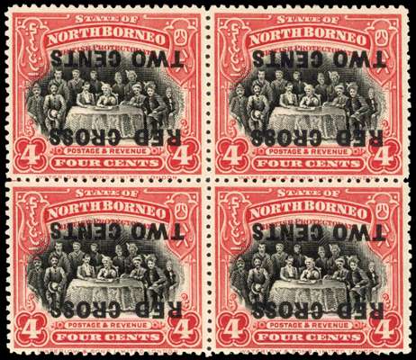 North Borneo SG 218a 1918 Red Cross 4c+2c block of 4 error surcharge inverted mint