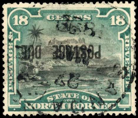 Postage Dues. 1895-97 18c black and deep green, with error overprint inverted, used with Sandakan cds, a few short perfs, otherwise fine. SG D10a, £400.