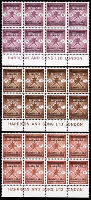 1972 (Mar.-Apr.) 5b reddish purple, 10b brown & 20b chestnut, Harrison & Sons opt type 23, in lower marginal imprint blocks of eight, mint unmounted o.g. very fine and scarce. SG 141-143 cat £960+