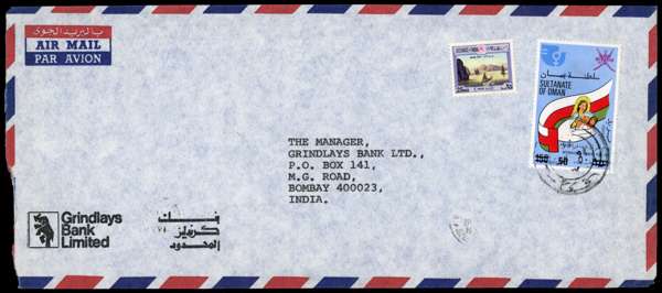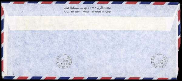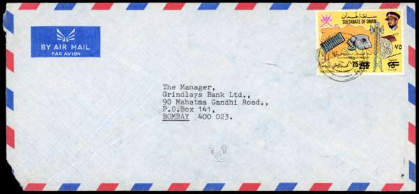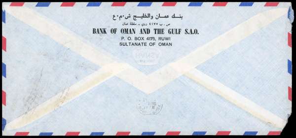 1978 pair of long air mail covers both addressed to India, with 50b on 150b and 25m (SG 149), and the other cover bearing 75b on 250b, both tied by cds and backstamped by Bombay arrivals, both covers opened at left, still an attractive commercially used pair. Scarce. SG 213-214 cat £1650+