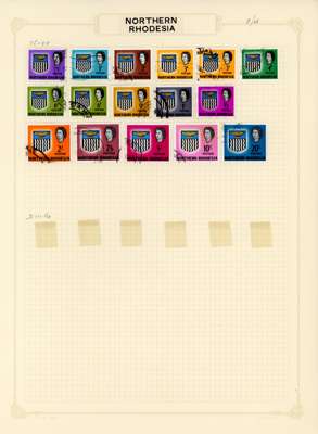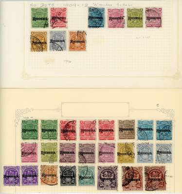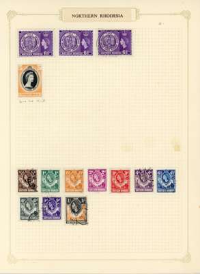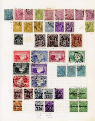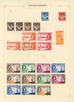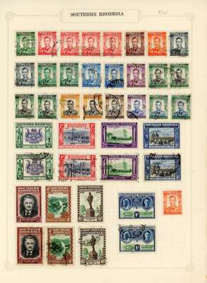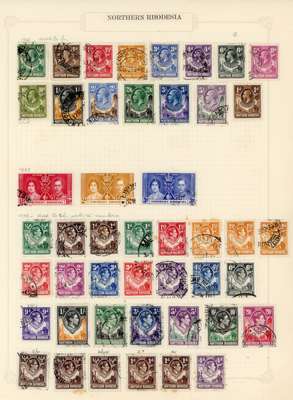 1892-1909 used collection on leaves with slightly duplicated Arms Types to £1, 1905 Falls set (1s stained, 2s6d with British Association cancel), 1909 set to £2 (two) and a group of ‘no stops’; ½d to 5s, less 2d and 3s. Also some Northern Rhodesia, KGV to 5s and KGVI values to 20s, and Southern Rhodesia with values to 5s