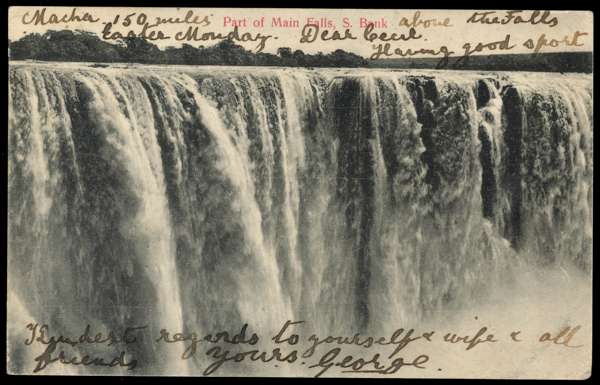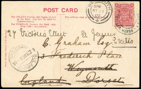 1905 picture postcard (Victoria Falls) to Weymouth, bearing 1d Arms tied by decent strike of the scarce NORTH WESTERN RHODESIA/ KALOMO CDS (Proud D2) for MY 2 05. Bulawayo transit, redirected on arrival to Weymouth