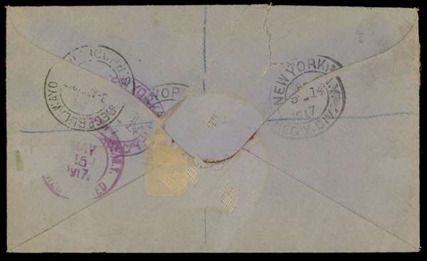1917 registered envelope to Wall Street with 1/- (No Gash plate) black and turquoise-blue, with ½d and Admiral 1d and 3d. Regd. Bulawayo DCs of 3 AP. Minor discolouration from the wax seal, which has been removed, causing minor damage to the reverse and a small tear at top