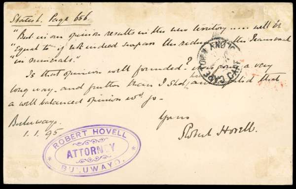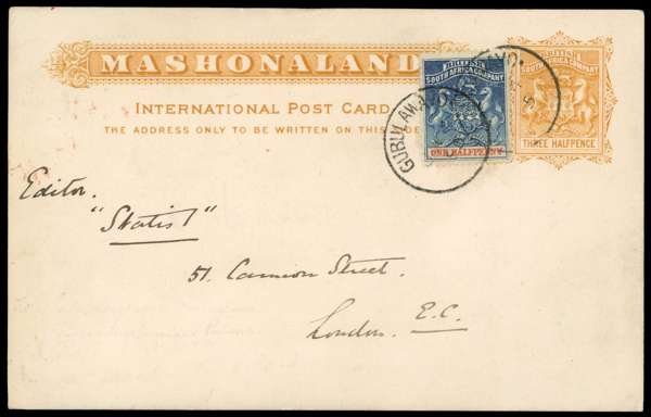 Postal Stationery. 1895 Mashonaland 1½d postcard uprated with ½d Arms, cancelled by two strikes of Gubulawayo CDS (Proud D1 State 2) of JA 4, Hinge mounting marks on reverse, otherwise fine