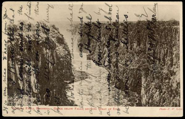 Postal Stationery. 1910 1d Arms card, the picture side (overwritten) being of the Gorge below the Victoria Falls, to Cheshire. Cancelled by Kasama squared circle (Proud D3) of SE 14 10, a fine impression. Broken Hill transit and Stockport arrival. Small corner crease, otherwise fine