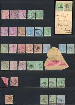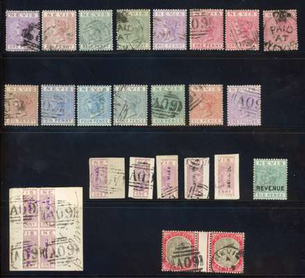 St Kitts (38) and Nevis (27) used collection. St Kitts with all basic SG numbers save SG 27, with extras including 1879 4d inverted watermark; 1884 4d full stop; 1885 ½d on 1d bisect strip of 3 on piece, and unsevered pair; 1886 1d on 6d and 1887 1d on ½d together on piece, RPS Certificate (2015) ex Dunlop, 1886 4d on 6d no stop (SG 25a), 1d on ½d no stop (clandestine). Nevis from 1879 with basic SG numbers with extra 1883 bisects, and Revenue 6d green. Mixed condition, as usual, but a nice collection