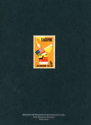 Singapore 1969 150th Anniversary 75c 'Map and Flags' perforated colour trial in the issued colours, affixed to Bradbury Wilkinson presentation card (115 x 153mm), fine and rare. SG 123.
