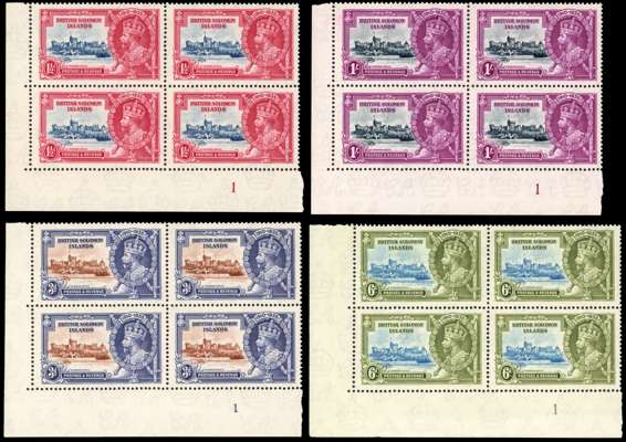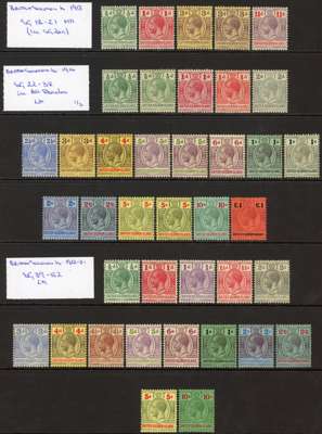 A mint KGV collection on stock pages, comprising 1913 set to 11d incl both shades of 3d, 1914-21 set to £1 incl listed shades of 1s and 5s, 1922-32 set to 10s, and 1935 SJ set in lower left corner blocks of 4, the 1½d and 3d with variety ‘Diagonal line by turret’ on lower pairs, minor traces of gum toning but generally fine, large part o.g. to o.g. (55)