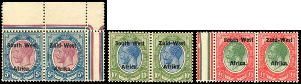 South West Africa SG 13/15 1923 5s, 10s, £1 setting II pairs mint