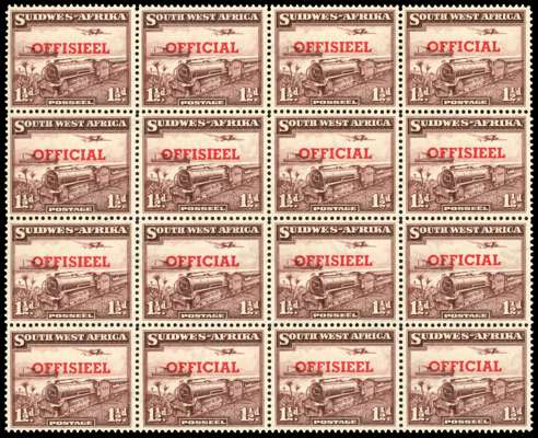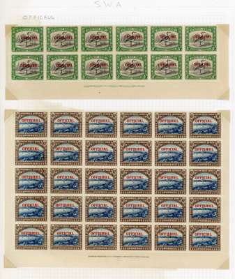 Officials. 1952 1½d block of eight pairs (4 x 4 stamps) from rows 3-6 with the lower two pairs showing overprints transposed, fine unmounted o.g. (£360), also some earlier blocks partially stuck down with some pairs recoverable, including SG O19 sheet and O22 block of fifteen pairs. SG O25, a